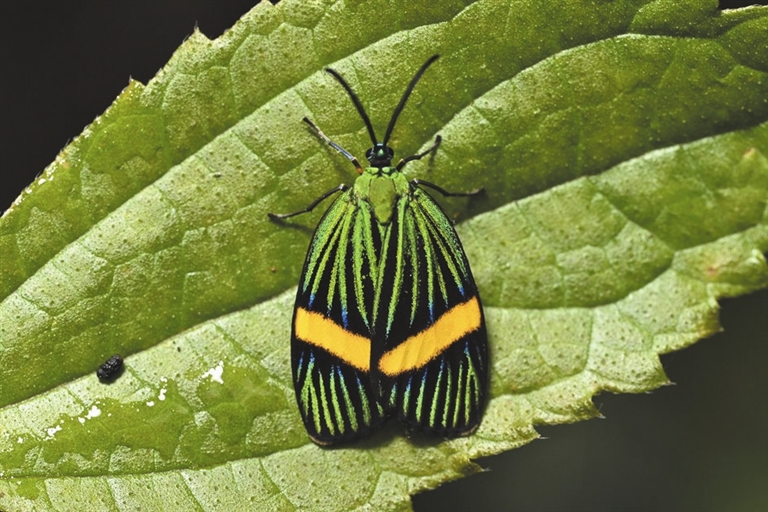 据介绍,“四面山缎斑蛾”隶属于鳞翅目斑蛾科,其前翅长13至18毫米,触角呈双栉状,翅面底色为黑色,由翅基部向外辐射出7条金属绿色长纹,在翅外缘处逐渐延伸分裂成9至10条,翅中央有一条引人注目的浓黄色带,接近黄色区域的金属绿色条纹则渐变为金属蓝色,十分艳丽。科研人员经过研究发现,该新种的外部形态和解剖学特征与其他已知种差异甚大,加之其艳丽体色与我国江南传统丝织物“织锦缎”的特征十分近似,因此建立新属“缎斑蛾属”。同时,该物种因新种模式产地在四面山,故命名为“四面山缎斑蛾”。