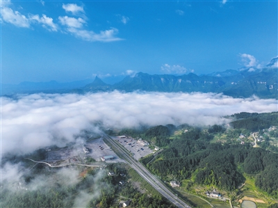 金佛山东麓云海景观和山间高速公路交织(无人机照片)。