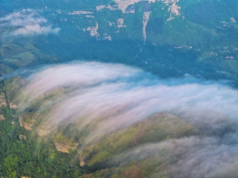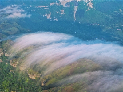 金佛山东麓,蒸腾的云雾宛如瀑布顺着山势飞流而下(无人机照片)。