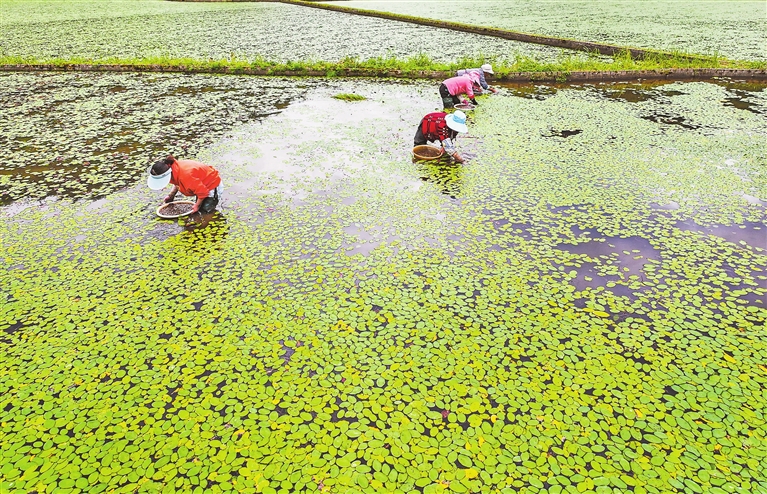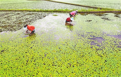 5月31日,石柱县黄水镇莼菜基地,村民正在田间采摘莼菜。