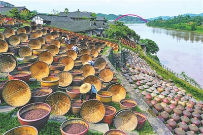 5月31日,泸州市合江县先市镇赤水河畔的先市酱油露天晒场,工人们抢抓晴好天气,忙着晾晒酱油。先市酱油传统酿制技艺是国家级非物质文化遗产,采用赤水河流域盛产的大豆、小麦和赤水河水等原料酿造,产品远销全国各地,有效带动了当地就业,助力乡村振兴。