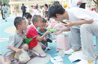 6月14日,永川区红星幼儿园云谷园区“星星集市”开业,小朋友和家长在自己的摊位上招揽生意,有的负责叫卖推销,有的负责收钱找零,小顾客们则认真地挑选自己心仪的商品,现场叫卖声此起彼伏,热闹非凡。孩子们沉浸其中,体验共玩共享、以物换物、买卖物品游戏的快乐。