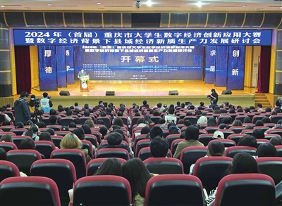 本报讯(渝西都市报记者 吕 薇 文/图)11月22日,2024年首届重庆市大学生数字经济创新应用大赛与数字经济背景下县域经济新质生产力发展研讨会在重庆城市科技学院永川校区拉开帷幕。此次大赛与研讨会汇聚了45所高校,1300余名师生及业内专家,共同探讨数字经济时代县域经济的新机遇与挑战。