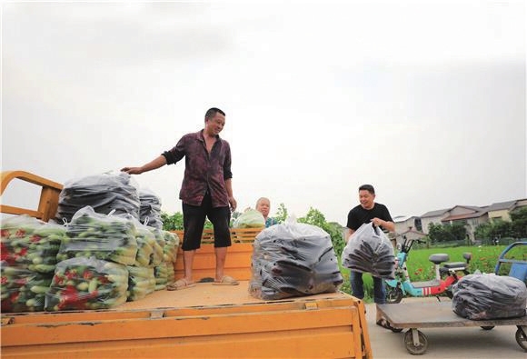 46岁的王先生驾驶着三轮车,来到通达蔬菜基地公路的装货点,与采摘蔬菜的工人们一起动手,把一袋袋的茄子、黄瓜麻利地装车,这些菜将送往大足区东关、西门农贸批发市场售卖。