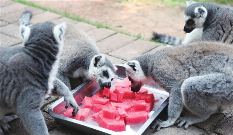 景区饲养员们分别为非洲象、黑熊、黑猩猩、河马、长颈鹿、环尾狐猴等动物送上可口多汁的西瓜、美味水果刨冰等美食。