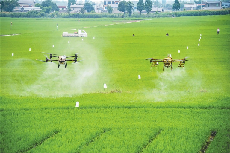 在传统水稻种植模式下,施肥喷药需要农民走进田间,逐行逐片进行。现在,技术人员将肥料农药装入无人机,在完成航线设定后,无人机立刻升空,奔向稻田植保作业,省时省力更省心。