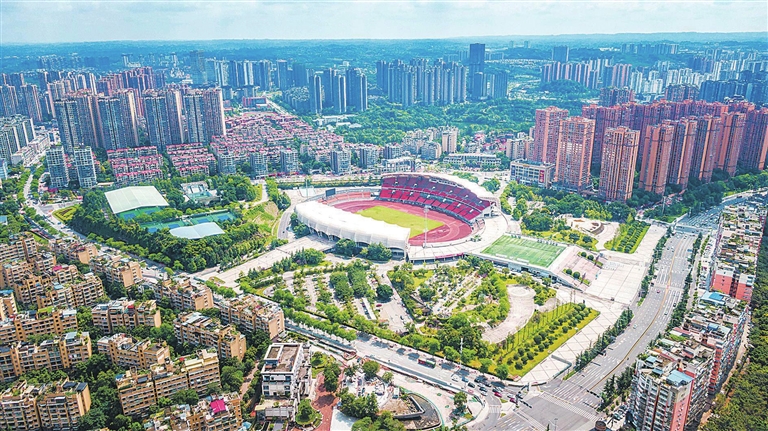 8月14日,从空中俯瞰坐落于自贡高新区的南湖体育中心,红色塑胶跑道、看台座位和铺设的绿色草皮相映成景。其占地300多亩,包括一座规模为2万座的主体育场、一个网球中心和一个室外训练场,是一座集竞技赛事、全民健身、文化娱乐等功能为一体的综合性体育中心。它每天迎接一波又一波市民前来打卡健身,满足大家高品质、多样化的体育健身需求。