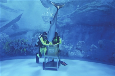 活动现场,主持人邀请小朋友们共同参与给海豚宝宝制作“生日蛋糕”,把海豚爱吃的多春鱼插在“蛋糕”上面。随后,工作人员将生日蛋糕装入约20斤重的特制蛋糕礼盒,并由两名身着潜水服的饲养员合力将“生日蛋糕”抬到水下,小心翼翼揭开礼盒盖子,取出里面的“蛋糕”食材——多春鱼,一条条投喂给海豚宝宝和海豚妈妈,它们香甜地吃着代表游客们祝福的食物。在场的孩子们还和演艺人员一起唱起了生日快乐歌,为“乐崽崽”送上真挚的祝福。