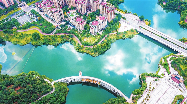 11 月5 日,蔚蓝天空下的龙湖公园,绿地环抱湖水,湖面波光粼粼,白云倒映其中,构成了一幅如诗如画的美景图。