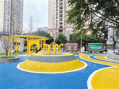 本报讯(渝西都市报记者 钟 梅 文/图)近日,位于永川城区化工路的跃进小游园“口袋公园”建成开放。公园以“运动休闲”为主题进行建设,设置了停车场,安装了乒乓球桌、太极揉推器、腰背按摩器等健身器材,还有秋千、吊环等儿童游乐设施。跃进小乐园作为“口袋公园”,虽然占地面积不大,但里面的设施设备和布局造型新颖、颜色亮丽,成为了附近市民休闲健身的好去处。