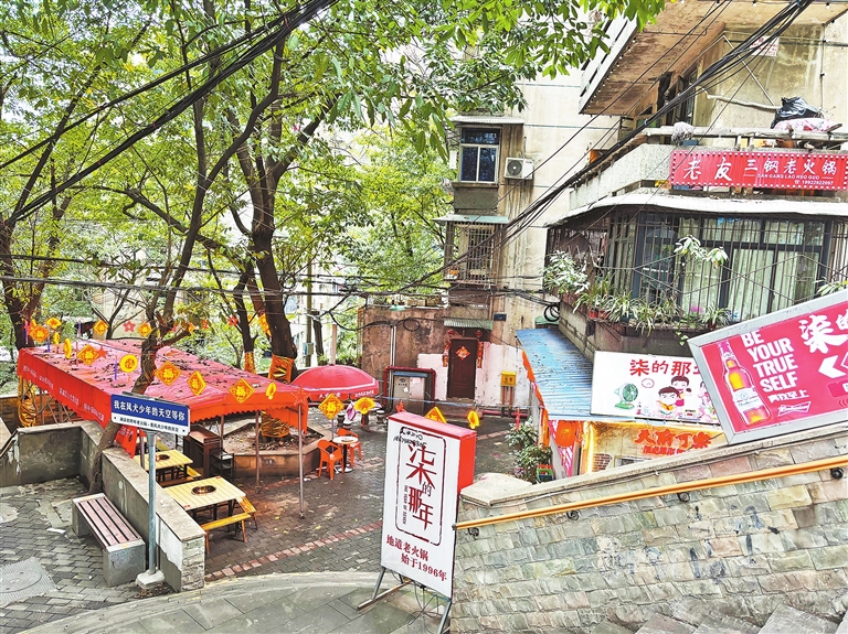 观音桥高楼林立、流光溢彩,一派都市气息。让人意想不到的是,距这里不足500米的背街小巷里,却藏着最原生态的市井烟火——爬满青藤的老房子、盘根错节的黄葛树、斑驳的石砖路、热闹又接地气的菜市场。这里,就是野水沟和大兴村片区,也是原三钢二厂所在地,电视剧《风犬少年的天空》曾在这里取景拍摄。