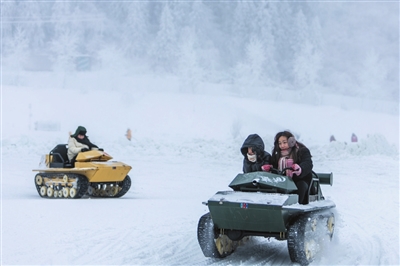 图②:1月25日,在重庆市丰都县的南天湖国家级旅游度假区,游客在冰雪乐园内体验“雪地坦克”项目。
