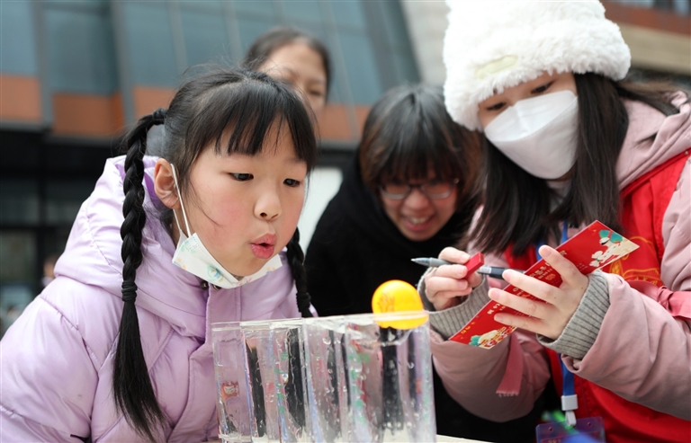 活动中,青少年在家长的陪同下参加了猜灯谜、滚铁环、水中夹珠、新年投壶、步步为营等12个趣味游园项目,现场加油声和欢笑声连绵不断。