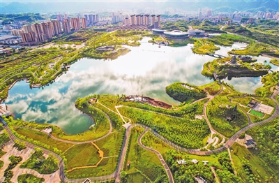 近日,垫江县东部新区三合湖湿地公园,波光粼粼的湖面与绿意盎然的湖岸交相辉映,构成秀美画卷。