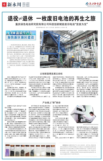 退役锂电池绿色高值循环利用是符合国家绿色低碳循环发展理念的新兴产业,也是一片商业“蓝海”。2021年10月,四川大学丁桑岚教授、苏仕军教授领衔的技术团队在永川区成立重庆绿色电池研究院有限公司,培育发展退役锂电池绿色高值利用产业。