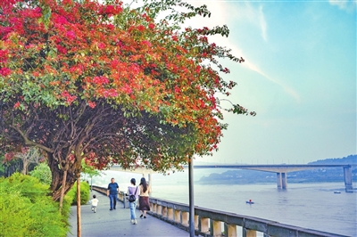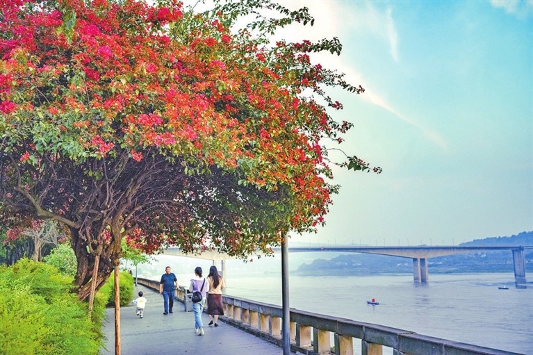 在公园街头,桃红柳绿、生机盎然。漫步江津滨江路,处处可见吐完新芽的绿树。道路两侧的绿植缀满各式各色的春花,无不昭示着春日的美好。茶余饭后,走在公园里、街道上,享受阳光和微风,闲适惬意,令人向往。
