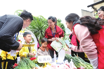 欢乐集市上,孩子们在老师、家长的带领下,兴致勃勃地摆放着琳琅满目的商品,有现做的飘香食品、拓印手绢、自制手工品,有种植园刚收获的蔬菜,有养殖区自养的小兔子和土鸡蛋等,并分别“明码标价”。在精美的摊位展板旁,孩子们个个变身“记账员”“营业员”“售货员”,叫卖声、砍价声此起彼伏。广大群众闻讯后纷纷赶来“抢”购商品。