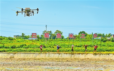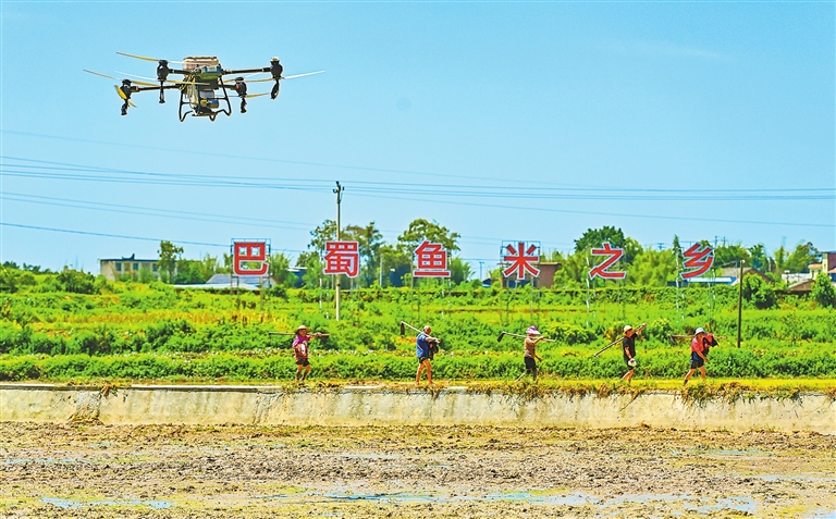 5月13日,荣昌区安富街道普陀村的稻虾田里,无人机播种、人工插秧、秧苗移栽同步进行。