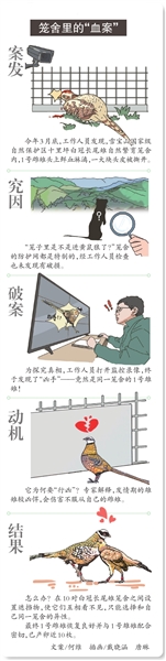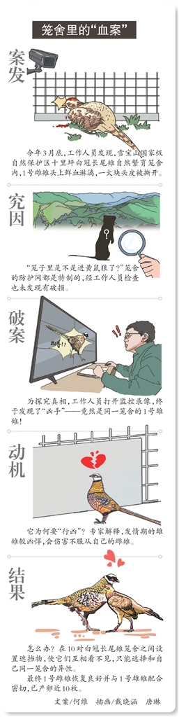 两人打开监控录像,一帧一帧地回放,终于发现了“凶手”——竟然是同一笼舍的1号雄雉!