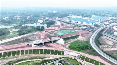 5月21日,永(永川)津(江津)陈食互通桥梁工程现场,挖掘机正在挖土,压路机在来回碾压,施工车辆来回穿梭装运施工建材和土石方,一派繁忙的施工景象。