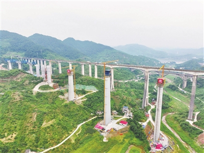 重庆日报讯 (新重庆-重庆日报记者 杨永芹 杨铌紫)6月11日15时,随着最后一方混凝土浇筑完成,渝万高铁全线重难点工程——高达150.5米的蔡家沟双线特大桥16号主墩封顶。这是国内在建高铁无砟轨道最高桥墩,标志着渝万高铁全线桥梁施工进入攻坚阶段。