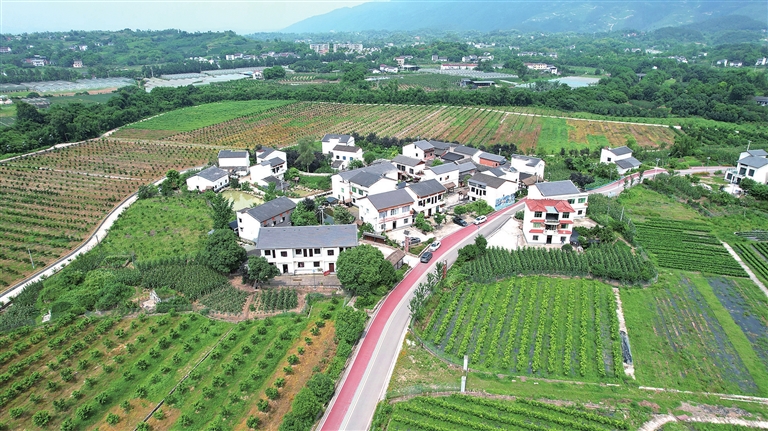 6月11日,鸟瞰璧山区七塘镇喜观村,干净别致的农家小院和远处绵延的青山相映成趣。