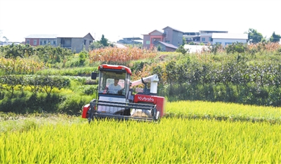 眼下正是水稻收割的关键时节。8月8日,在仙龙镇石宝寺村凉林村民小组,收割机在稻田间忙碌,利用晴好天气加紧收割成熟的水稻。
