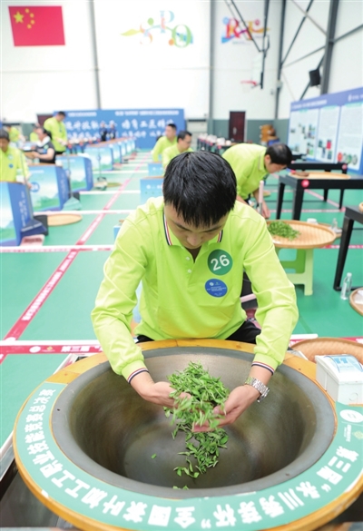 上午9时许,在茶叶加工竞赛区域,选手们分立于制茶锅前,在领到相同重量的鲜茶叶后,通过杀青、做形、干燥等程序,制作出不同形态、不同香味的茶叶。在选手们两个半小时的精心炒制下,制成的绿茶新鲜出炉,现场弥漫着阵阵茶香。