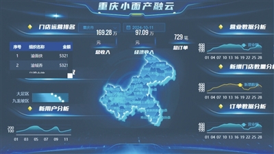 走进小面大做(重庆)商业有限公司,记者看到,蓝色的“重庆小面产融云”平台数智大脑显示屏上,不断大量跳跃更新着大量实时监测数据,包括小面企业的订单情况、经营收入、新用户分析、门店运营排名等。