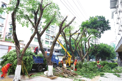 12月9日,在胜利路街道石油路,园林工人正在修剪街道两旁的绿化树木。