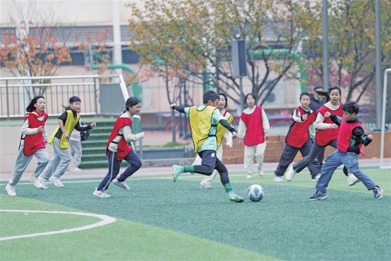 近日,大足区海棠小学的学生们正在进行足球比赛。该校将足球运动作为兴趣课程,通过完善基础设施,组建校园足球队,利用课外活动时间进行足球训练和比赛等,让更多的孩子接触足球,感受足球运动的魅力。