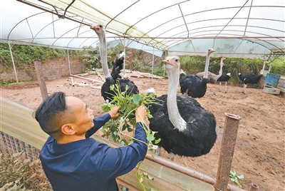 近日,沙坪坝区青木关镇管家桥村的重庆好锄艺农业专业合作社,农民正在喂养鸵鸟。