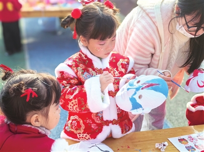 民俗文化节期间,大安中心幼儿园里张灯结彩,老师和孩子们共同制作的灯笼、福字、对联、拓印画、脸谱、窗花、泥塑等传统文化手工艺品随处可见,处处流淌着传统文化的气息。活动中,孩子们通过投壶、画脸谱、做传统手工等,把节日的氛围拉满。