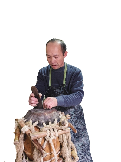 祝明建说,这鼓看着虽小,但拿起来却有10几斤重,制鼓的工艺和程序也不简单,完全学会得要几年时间。首先是制鼓的原材料比较难收集,制作品相好的鼓,需要用到上等的柏木,还有至少2年以上的牛皮;其次是制鼓的周期长,柏木买回来要存放晾晒一两年的时间,封鼓的牛皮也要花1—2个月晾干水分,这样制作出来的鼓,声音听起来才会清脆悦耳。