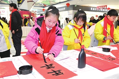 1月17日,永川区子庄小学在永川里奥特莱斯一楼大厅举办了“党建引领创特色 翰墨书香送祝福”系列送春联送祝福活动。