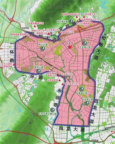 (二)禁放区域周边已建成的居民小区和人员聚集场所纳入禁放区域管理,包括文博书香小区、中铁梧桐苑小区、碧桂园·翡翠湾小区、永川区博物馆、神女湖公园、御景国际小区、山水林涧小区、植物苑小区、锦绣山水小区、宏帆棠麓源小区、香海温泉度假景区、吉之汇国际农贸物流城、利安·凰城御府小区、永南物流园、回龙苑小区、恒大·悦府小区、乐和乐都主题公园(见附图)。