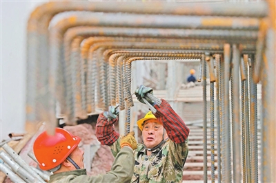 ▲2月5日,彭水渝厦高铁彭水西站施工现场,工人们正在搭建钢架,加快彭水西站纵三路一标段的桥梁的建设。