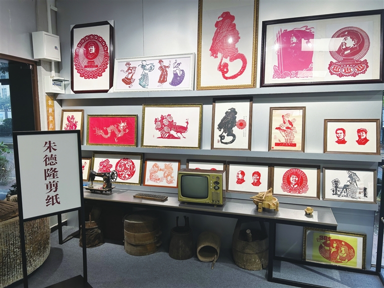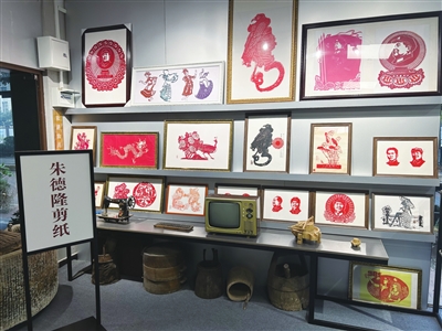 环顾工作室四周,墙壁上悬挂着一幅幅朱氏刻纸精品,有革命年代的劳动人民肖像、山水花鸟以及现代的校园生活场景,题材丰富多样,工艺精美细致,无不彰显着这门技艺的创新活力。“这上面几幅毛主席肖像是我的父亲留下来的,他的一生都致力于钻研刻纸艺术,给我留下了很多宝贵的资料。”朱德隆表示他退休后便每日整理父亲的作品,在其基础上进行传承创新。