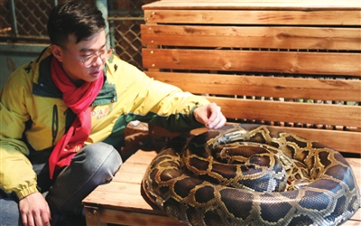 但是有这样一群人,他们不仅要经常跟蟒蛇打交道,还要全心全意地照顾它们,做蟒蛇的贴身“大管家”,乐和乐都动物主题乐园蟒蛇馆的饲养员王知丰就是其中一位。
