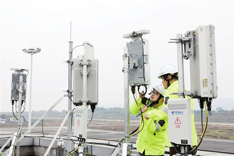 “此次在机场投用的5G-A基站,采用了最新的通感一体化技术,就像给基站装上了‘眼睛’和‘耳朵’。”中国电信永川分公司同样在大安通用机场布局投用5G-A基站。该公司副总经理黄淼介绍道,在传统技术下,无人机的传输速率约为10—50Mbps,存在通信速率低、信号丢失高等痛点。而大安机场新建的5G-A通感一体基站,实测在低空的传输速率可以达到600Mbps,时延在20毫秒以内,这一突破性的进展对于低空飞行器的操控和监控带来了显著的改善。“这一技术还可以应用于航拍、农业监测、环境监测等多个领域,为低空飞行器的广泛应用提供有力支持。”黄淼说。