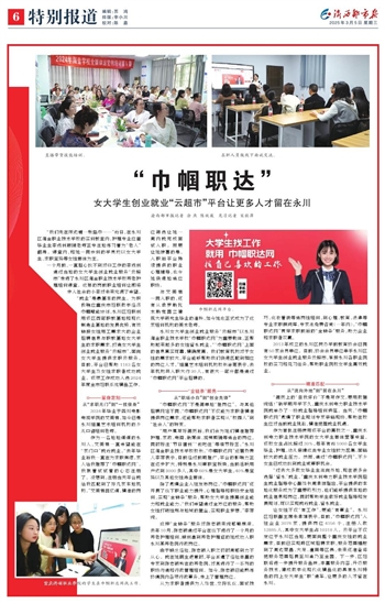 让女性不仅“有工作”,更能“有事业”。永川区妇联副主席朱孝娟表示,目前,“巾帼职达网”入驻企业2078家,提供岗位4156个,注册人数12885人,其中女大学生占10318人。云平台不仅定位于永川区当地,更面向整个重庆女性的就业需求,目前已实现跨区域招聘求职,服务范围辐射到了周边荣昌、大足、潼南等区县,未来还准备将把服务范围拓展至川渝乃至全国。下一步,区妇联将进一步提升服务品质,丰富服务内容,升级服务技术,建成数字化现代化精品化的具有永川特色的网上女大学生“职”通车,让更多的人才留在永川。
