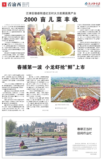 近年来,像红豆村这样通过蔬菜产业致富增收的村社有很多,如吴滩镇郎家村、白沙镇土地村等,其发展的蔬菜基地都是江津区蔬菜产业发展的典型缩影。蔬菜产业是江津区“1324”现代农业特色产业体系中的三大保供产业之一,目前,江津区正全力打造“一带一区N园”(沿江早菜带、高山蔬菜区、设施蔬菜园)的产业格局,推动蔬菜产业向标准化、规模化、集约化的现代化农业转型,进一步帮助群众拎稳“菜篮子”。