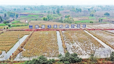 2月21日,记者在二郎镇联珠村“稻虾”种养基地看到,小龙虾养殖业主和村民身穿防水服,穿梭在稻田里,收取前一天布置的用来捕虾的地笼。