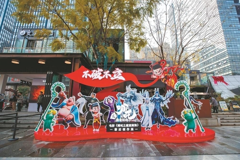 在展厅外侧,哪吒、敖丙等电影中的10余个经典角色以立体雕像的形式集中呈现,吸引了大量观众前来打卡拍照,留下一张“有哪吒、有双塔”的合影照片。据悉,交子大道作为成都高新区重点打造具有“国际范儿,成都味儿”的地标性街区,逐渐以“科技+文化”双轮驱动成为城市文化新地标。