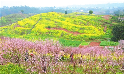 在乡村,永川区五间镇圣水湖桃花岛,7000余株桃树进入盛花期,粉红、鲜红、双色桃花次第绽放;长江畔的周公沱千亩油菜花正值最佳观赏期,金黄花浪与碧水相映,形成独特的“水岸花廊”景观……