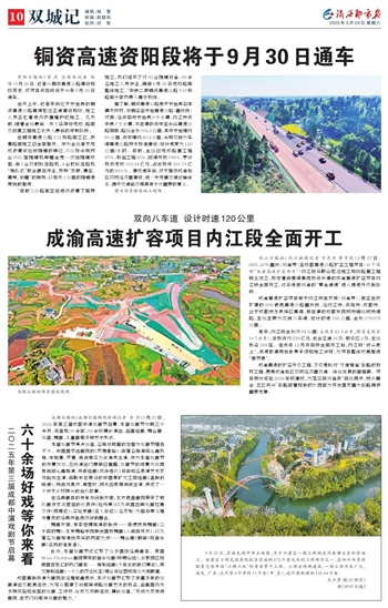 资阳日报讯(曾 燕 全媒体记者 陈维)3月26日,记者从铜资高速公路建设现场获悉,该项目资阳段将于今年9月30日通车。
