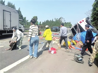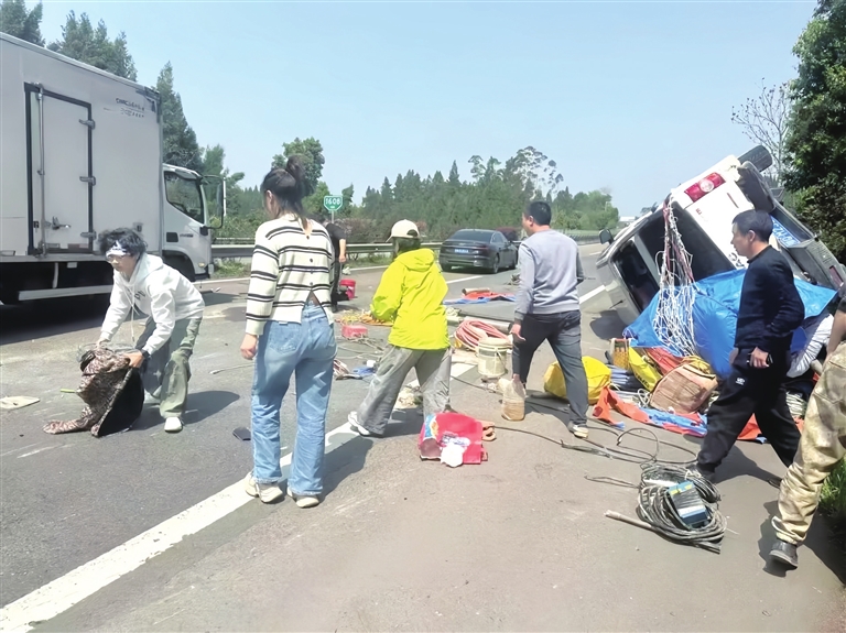 4月7日14时左右,重庆沪蓉高速某路段发生惊险一幕:一辆皮卡车因爆胎失控撞向护栏后侧翻,三人被困车内,货物散落路面,情况危急。关键时刻,重庆科创职业学院教师何颜明带领四名学生紧急停车,联合路过的司机展开救援,成功救出被困人员,以实际行动诠释了“危急时刻敢担当”的社会责任。