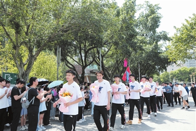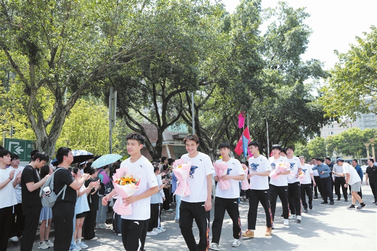 本报讯(渝西都市报记者 张玲/文 陈仕川/图)4月17日中午,重庆文理学院大门处掌声雷动,学校师生代表以最高礼仪迎接在第27届中国大学生篮球一级联赛西南赛区勇夺亚军的校篮球队凯旋。仪式现场,校领导为队员献上鲜花,全场高呼“文理男篮,决战国赛!”以青春热血与家国情怀交织的盛况,彰显体育育人成效。