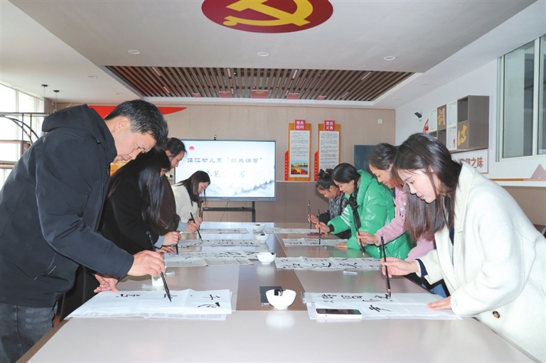 经过多年探索,该园已探索出“党建+传统文化”特色路径,党支部不定期开展诗词鉴赏、书法培训等活动,不断提升教师队伍的文化素养与育人能力。目前,《沂蒙花开》朗诵视频已纳入园本红色教育资源库,部分书法作品将用于班级文化墙建设。