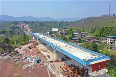 4月23日,位于沙坪坝区凤凰镇的成渝中线高铁重庆段黄家嘴双线特大桥施工现场,该桥上跨规划海达路连续梁顺利合龙,正抓紧进行桥梁后续施工。